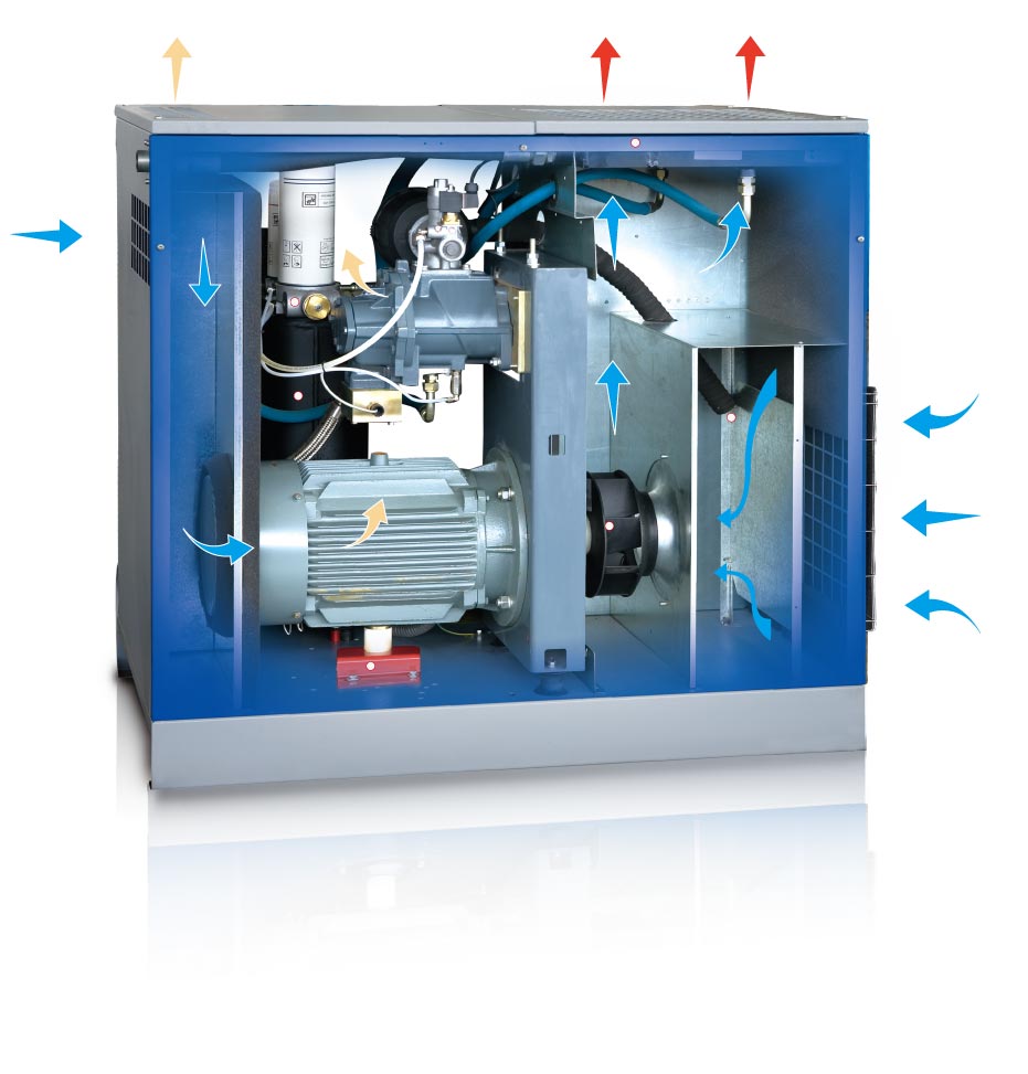 壓縮機冷卻系統(tǒng)由安裝在主電機上的大排量風(fēng)扇提供冷卻風(fēng)量,無需另裝專門的冷卻風(fēng)扇,減少運動部件,降低故障因素,使機器運行更加可靠。
